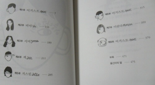 이 책은 어거스트의 이야기가 중심이 되고, 그를 둘러싼 주변인물인 비아, 서머, 잭, 저스틴, 미라다가 각 장마다 주인공이 되어서 같은 시점의 이야기를 자신들의 시각으로 그려나가도록 구성이 되어 있다.