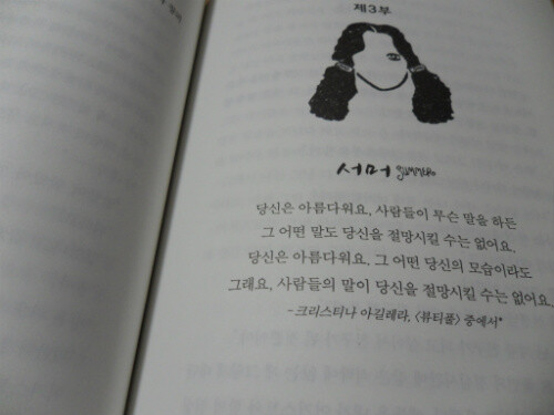 " 굳이 고개를 들지 않아도 온통 시선이 나에게 집중되고 있음이 온 몸으로 느껴졌다. 다들 옆구리를 쿡쿡 찌르며 흘깃 흘깃 곁눈질로 나를 살폈다. 그런 시선쯤은 예사롭게 넘길 정도는 되었다고 생각했는데 착각이었다. " (p. 87)