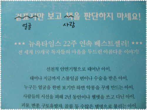이 책의 주인공인 어거스트는 선천적으로 안면 기형을 가지고 태어난다. 27 차례의 대수술을 했지만, 그 아이를 보는 사람들은 누구나 '헉' 하고 놀라거나 아이들일 경우에는 '꽥'하고 놀랄 정도로 얼굴이 형편이 없다. 심한 화상을 입었다고 생각할 수 있을 정도로 기이한 외모를 가지고 있다. 마치 곤죽처럼 뭉개진 얼굴을 가진 아이이다.