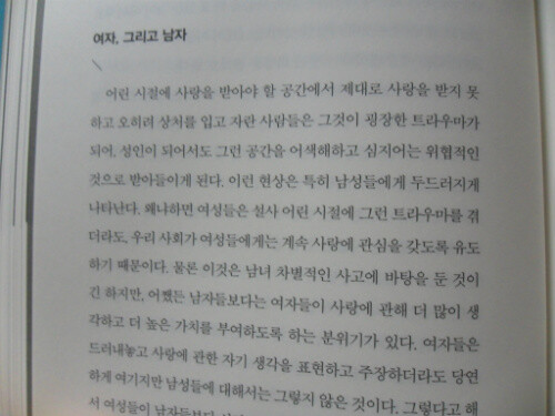 앞에서도 말했듯이 <화성에서 온 남자, 금성에서 온 여자>가 남성적 시각에서 출발했기에 남성과 여성의 다름을 인정하고 여성은 남성의 특성을 받아들이라는 의미가 담겨 있다면, 는 여성적인 시각과 페미니스트의 시각이 많이 들어간 책이다.