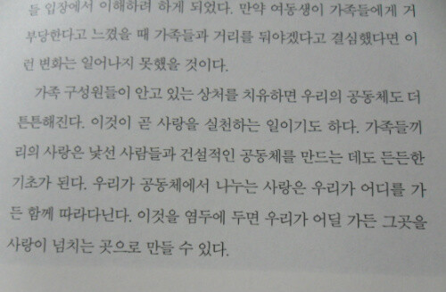 그녀에게 많은 영향을 주었던 '스캇 펙'에 의하면 사랑은 느낌이나 감정이 아니라 행동이다. 그래서 그 행동에는 책임이 따르게 된다는 것. 저자는 말한다. '사랑'은 명사가 아닌 동사라고....