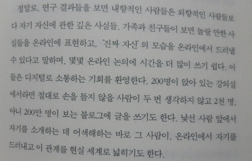 그런데, 재미있는 것은 타인들 앞에서 자신의 생각을 말하기를 꺼리는 내향적 성향의 사람들도 블로그에서는 200 만명이 넘는 사람들이 자신의 글을 읽는다고 해도 아무런 거리낌없이 글을 올리고 있다는 것이다.