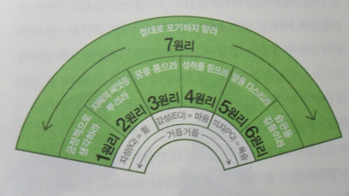 " 무지개 원리의 중심은 꿈과 신념이다. 이를 현실에서 이룩하기 위하여 그 앞의 '긍정적 생각'과 '지혜' 그리고 그 다음의 '말'과 '습관' 이 연합하여 협력하게 함으로써 성취도를 높인다는 것이 '무지개 원리'의 작동 개념이다. 여기에 일곱 번 째 성취인자인 '절대 포기하지 않기'가 가세하여 완성도를 높인다는 취지가 '무지개 원리'의 톨합적 존재 기획이다. " (p. 263)