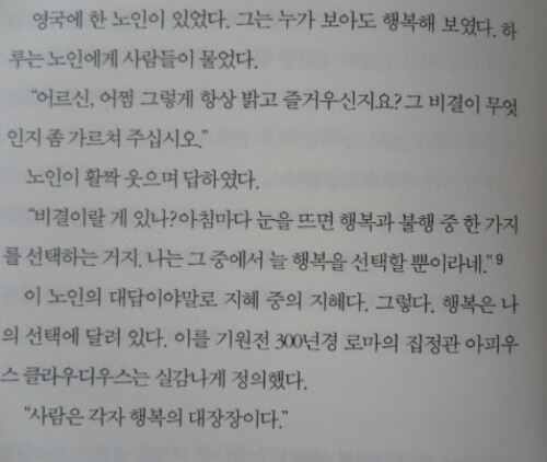 노인의 답은, " 아침마다 눈을 뜨면 행복과 불행 중 한 가지를 선택하는 거지. 나는 그 중에서 늘 행복을 선책할 뿐이네." (p. 72)