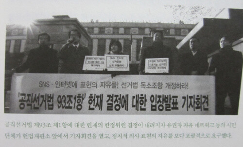 공직선거법 제 93조 제 1항에 대해 '인터넷에 정치적 의견을 표현하는 것까지 금지하는 것은 위헌'이라는 한정위헌 결정이 나온 사례에 대한 이야기로부터 이 책은 시작이 된다.