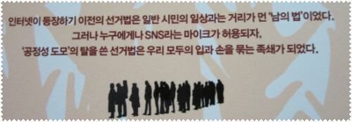 이런 이야기들과 함께 이 책에서 가장 중점적으로 다루는 것은 공정선거라는 명분아래 유권자의 정치 참여를 과도하게 막고 있는 현행 선거법에 대한 내용들이다.