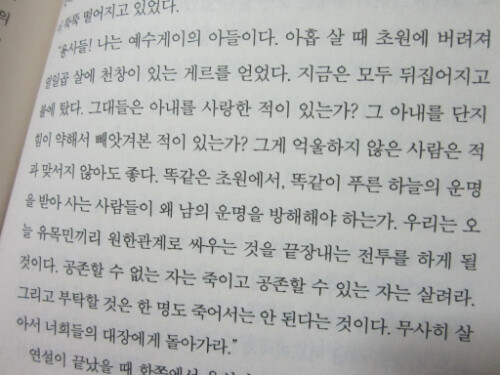 그래서 이 소설은 몽골의 풍경처럼 아름답기도 하고, 몽골인의 기질처럼 강하기도 하고, 아뭏튼 다양한 색채를 띤 그림처럼 여러 모습으로 표현되는 것이다.