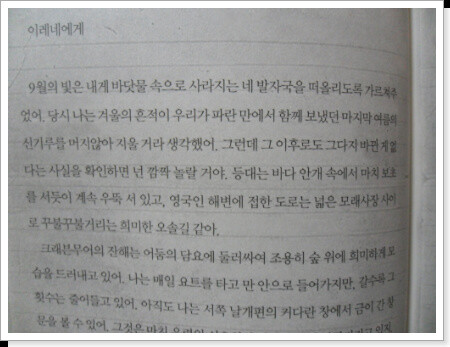 '9월의 빛'의 책장을 넘기자 마자 까만 바탕에 저자가 한국 독자에게 보내는 싸인이 담겨있다. 저자의 한국 독자에 대한 애정이 담뿍 담겨진....