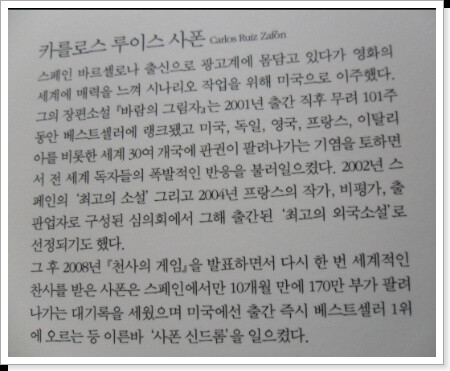 '카를로스 루이스 사폰'은 '천사의 게임'으로 나를 매료시켰던 미스터리 소설 작가이다. 나에게는어쩌면 인생은 천사의 게임일지도 모른다는 단상이 떠올랐던 작품이었는데, 그 소설이 좋았던 것은 미스터리 소설이지만 명쾌하고 확실한 결말이 아닌 독자들의 의식수준에 맡겨진 결말이 '천사의 게임'을 더 빛나게 했고, 읽은 후에도 한참동안 여운이 남았던 소설이었다. '천사의 게임'은 2008년에 발표되면서 스페인에서만 10개월만에 170만부가 팔려서 '사폰 신드롬'이 생겼던 작품이다. 그 이전의 작품으로는 2001년의 '바람과 그림자'가 101주동안 베스트셀러에 랭크되기도 했었다.