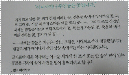 책 속의 한부분인데 이 글이 의미하는 바가 상당히 크다는 것을 책장을 닫으면서 느끼게 된다. 이런 장르의 소설을 읽은 후에 오는 개운함보다는 읽은 후에 더 많은 생각이 남는 그런 여운을 지닌 책이다. 그래서 나는 '이정명'님의 소설을 즐겨 읽고 언제나 새로운 책이 나오기를 기다린다. 저자의 책들이 대개는 2권으로 구성되어 있는데 비하여 '악의 추억'은 1권의 단행본이지만 이 책의 335페이지는 어떤 책보다도 많은 것을 시사하고 느끼게 해 준다.