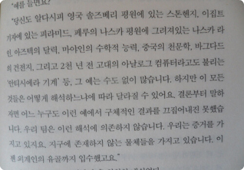 "인간의 세계관은 우주에 존재하는 생명체가 우리밖에 없다는 생각에 바탕을 두고 있습니다. 인간만이 독보적인 존재요,신에 의해 창조된 축복받은 존재라는, 어떻게 보자면 상당히 오만하고 이기적인 생각이지요. 은하수에만 수십억 개의 별이 있습니다. 그리고 이 은하수는 수천억 개의 은하계중 하나일 뿐입니다. 그런데도 우리는 이 거대한 우주에서 생명을 가진 유일한 존재라고 스스로 믿고 만족하지요" (...) "인간은 모든 것을 동시대적 지식과 경험에만 비추어 생각하고 분석하려는 경향이 있습니다. 우리는 스스로 발전의 마지막 단계에 살고 있다고 생각하지요. 우리의 사고한계를 넘어서는 기술에 대해서는 이해하려 들지도 않습니다. (p500)