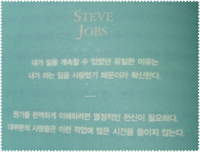 그 책들을 읽으면서 느낀 점들은 과연 잡스는 상식을 깨는 발상을 가지고 있으며, 자신이 생각하는 상상 속의 세상을 도전과 열정으로 이루어 냈구나 하는 생각을 해 보기도 했다.
