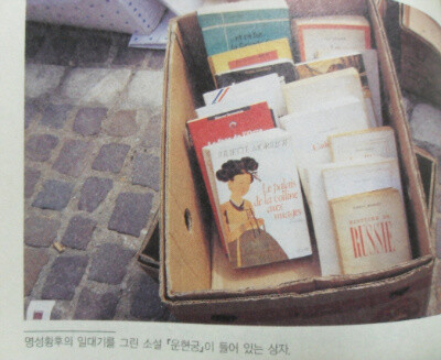 " 길바닥에 펼쳐진 책 상자 속에서 우리에게도 잘 알려진 프랑스 소설가 쥘리에트 모리오가 지은 명성왕후의 일대기 <운현궁>이 성큼 눈에 띄었다. " ( p 54 )