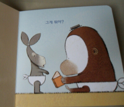 그런데, <책이 뭐야?>는 몽키가 가지고 있는 책을 동키는 책의 모양과 쓰임 등을 보고 "그게 뭐야?" 라고 물어보게 되는 것이다.