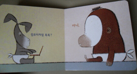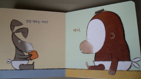그리고 <그래, 책이야 !>에서는 동키와 몽키와 제법 어린이티가 나는 캐릭터로 옷까지 단정하게 입었었는데, <책이 뭐야?> 에서는 동키와 몽키가 기저귀만 차고 있는 것이다.