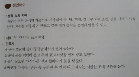 그밖에 천연채수는 각종 요리에 다 들어갈 수 있는 것으로 만드는 방법을 익혀서 어떤 음식에나 적용시킨다면 좀더 맛깔스러운 요리가 될 수 있을 것이다.