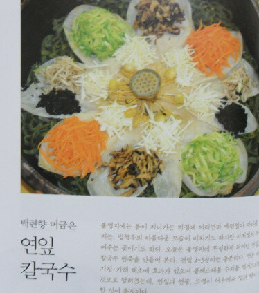 연잎칼국수는 영양, 건강, 아름다움까지 갖춘 예술작품을 감상하는 느낌을 주는데, 절에서 많이 볼 수 있는 연잎은 어혈제거, 기침, 가래에 효과가 있고, 콜레스테롤 수치까지 낮추어 준다고 하니, 일거양득이 아닐까 하는 생각이 든다.
