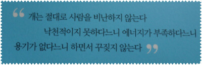 이 책을 읽으면서 개를 좋아하는 애견인으로서, 많은 것을 생각하게 해 주는 내용들이 다수 포함되어 있음을 느끼게 된다.