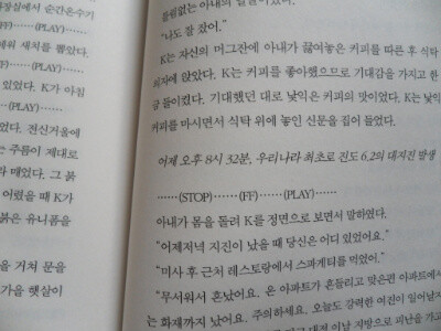 K 라는 주인공이 토요일 아침 7시에 익숙한 자명종 시계 소리에 일어나면서부터 자신이 평소에 생활하던 집임에도 어떤 이유에서인지 낯설게만 느껴지는 이야기가 월요일 8시 14분 지하철을 타기 직전의 지진이 일어나는 때까지의 3일간의 이야기를 담고 있다.