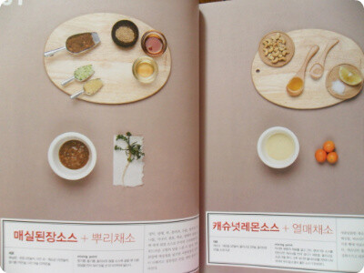액젖생채소소와 잎채소, 매실된장소소와 뿌리채소, 쑥소스와 해물, 양파즙 레몬소소와 해물, 냉이소소와 생선& 육류.