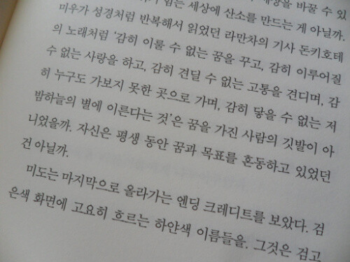 " (...) 라만차의 기사 돈키호테의 노래처럼 '감히 이룰 수 없는 꿈을 꾸고, 감히 이루어 질 수 없는 사랑을 하고, 감히 견딜 수 없는 고통을 견디며, 감히 누구도 가보지 못한 곳으로 가며, 감히 닿을 수 없는 저 밤하늘의 별에 이른다는 것'은 꿈을 가진 사람의 깃발이 아니었을까. 자신은 평생동안 꿈과 목표를 혼동하고 있었던 건 아닐까" (p. 401)