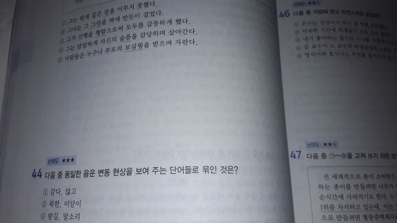 p62의 07번을 보면 ★★★로 난이도가 높습니다. 그러나 사자성어 관련 한자만 읽을 줄 알면 그리 어렵지 않게 해결할 수 있습니다. 제 주변 어느 지인은 선지 ④를 보고 이 "괄목상대"는 왜 안 되냐고 하던데, 지문 중 취준생 민수가 가정 형편이 어렵다고만 했지 종전 실력이 나쁘다고 한 부분은 없습니다. 만약 다른 수험생 철수가 등장하기라도 해서 "원래 학업 성적이 매우 부진하였으나 노력을 통해..."라고 했다면 ④가 답이 될 수 있었겠습니다.