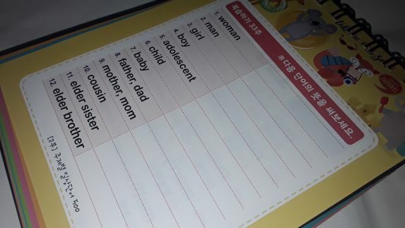 책은 183일차까지 진행된 후 반대 방향으로 틀어서 184일차가 시작됩니다. 양면 인쇄라서입니다. 교육부 지정 800단어는 222일차까지 계속되고, 223일차에는 1주분량 복습, 224일차에는 회화 공부(7의 배수일차에 회화가 나옵니다. 224도 7의 배수이죠), 225일차부터 제2부 주제별 일상단어가 시작됩니다. "노인"은 elderly person이라고 나오는데 여기서부터는 영한이 아니라 한영, 즉 한국어 단어를 먼저 제시하고 영단어를 제시합니다. 그런데 이렇게 하면 복습 퀴즈도 한영으로 물어 볼 줄 알았는데 퀴즈는 여전히 1부처럼 영한으로 물어 봅니다. adolescent 같은 단어는 참 초등학생한테는 어렵겠다 싶습니다.
