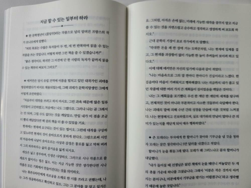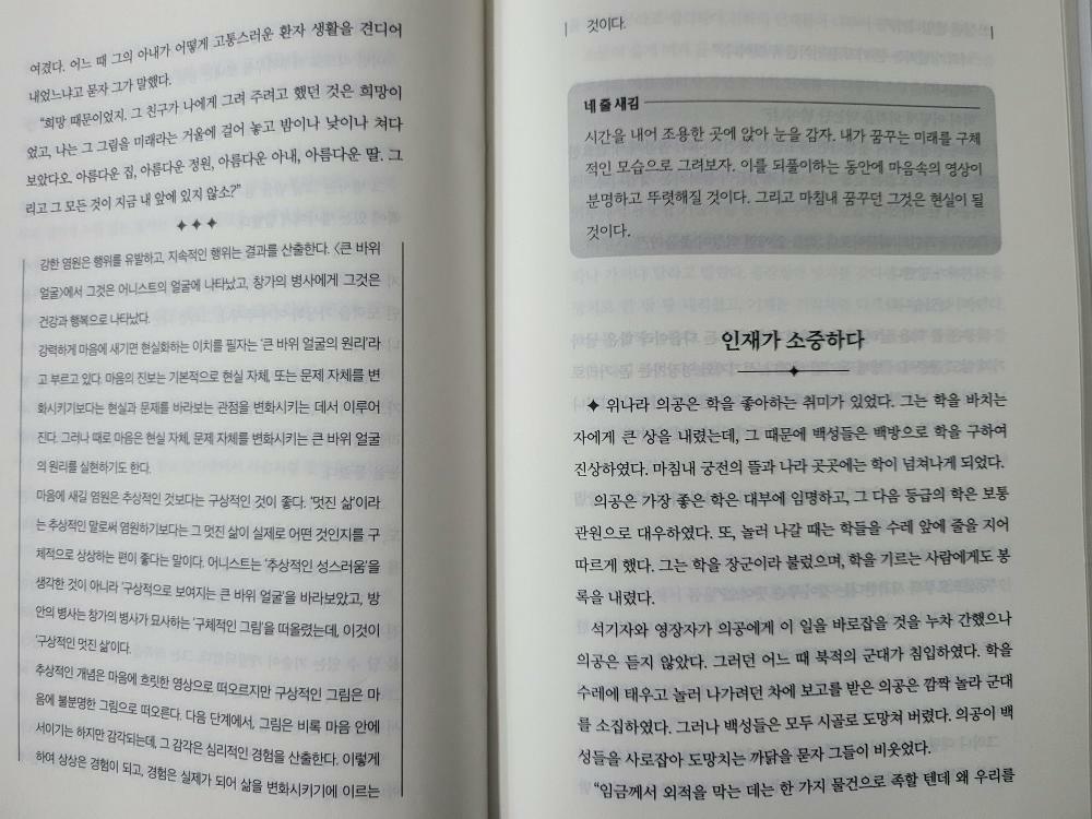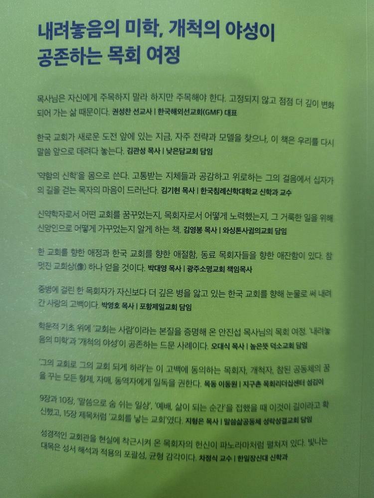 이 책은 조급한 마음을 내려놓고 창밖의 풍경을 감상하며 걷는 산책과도 같은 책이다. 저자의 문장은 화려하지 않으나 깊이가 있고, 날카롭지 않으나 심령을 찌르는 힘이 있다.