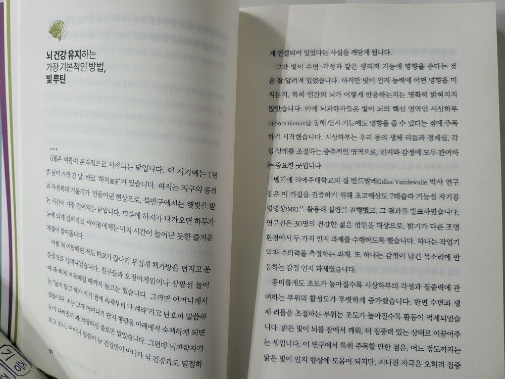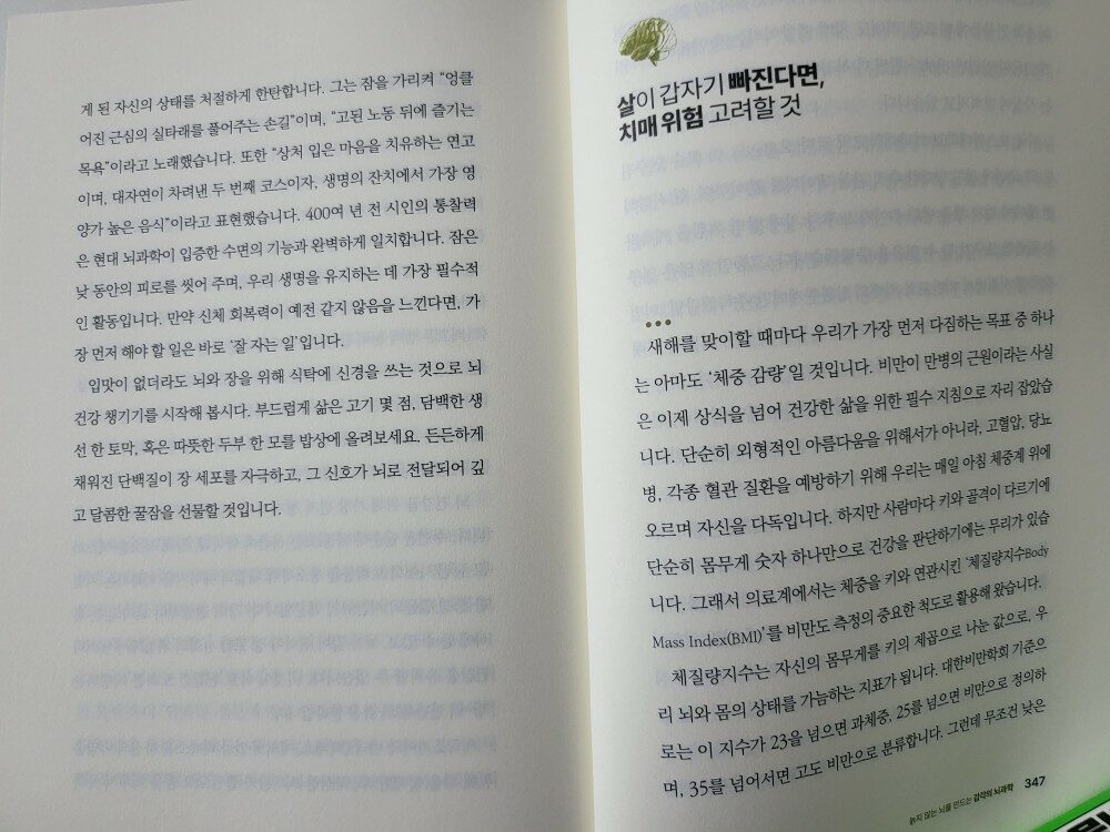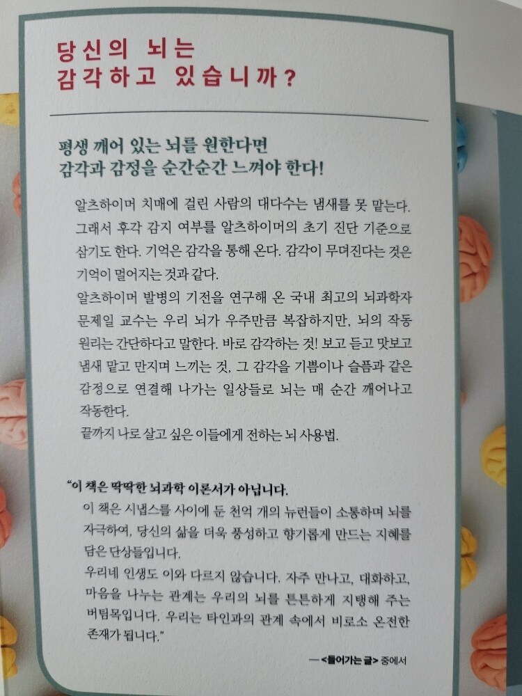 이 책은 노화에 대한 막연한 두려움을 과학적 확신으로 바꾸어준다. 저자는 뇌를 정교한 기계가 아닌, 끊임없이 변화하고 적응하는 유기체로 바라보게 한다. 책을 읽고 나면 내가 매일 마주하는 풍경, 소리, 냄새가 얼마나 소중한 뇌의 양식이었는지를 깨닫게 된다.