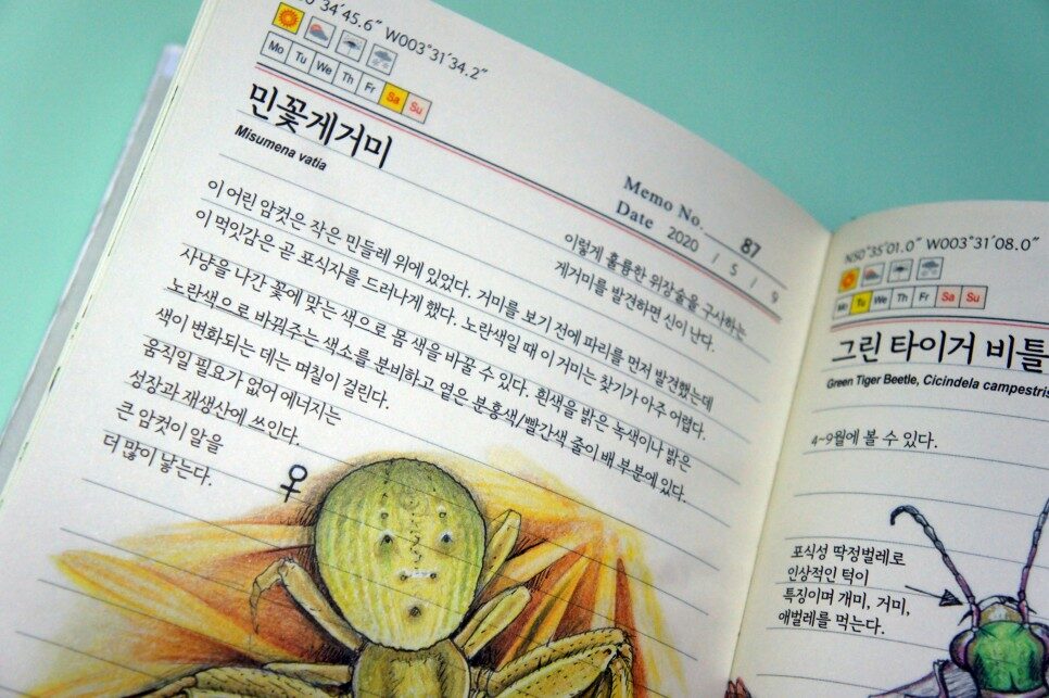 왼쪽 상단에 보면 사진을 찍은 장소를 일러준다. 좌표라든가 '우리 집 정원' 등 발견 장소를 적어놓고, 날짜와 요일, 날씨도 표시해두었다. 순서는 2018년 4월 20일부터 2020년 5월 24일까지로 시간 순서대로 되어 있으며 간단한 특징을 메모해두었다.