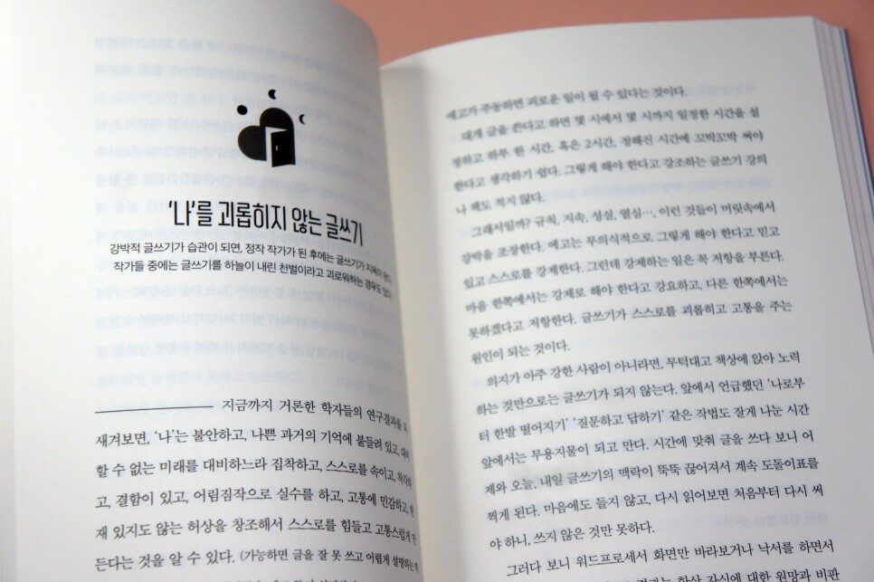 이 책을 읽으며 진지하게 나 자신의 내면을 들여다보는 시간을 보냈다. 한때는 글 쓰는 것이 명상에 가까워야 한다는 생각에 꽤나 진지하게 접근했던 적이 있다. 지금은 되도록 가볍게 부담 없이 접근하고 있고 말이다. 어쨌든 중요한 것은 둘 다 필요한 것이고, 둘 다 잊지 말아야 할 글쓰기 방법이라는 생각이다. 그리고 나는 한동안 '글을 쓰는 시간이 명상의 시간'이라는 마음을 잊고 살고 있었으니, 이 책을 계기로 수면 위로 떠올려보는 시간을 갖는다.