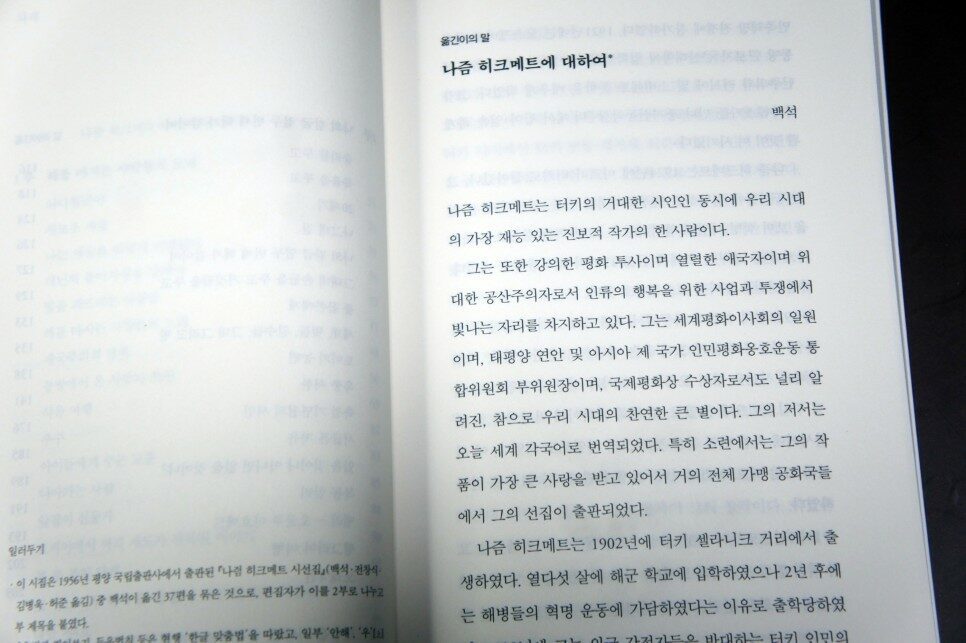 비록 이 책이 백석의 번역시가 다수 실려 있는 『나즴 히크메트 시선집』(1956, 평양 국립출판사)이 터키어에서 러시아어로 번역된 것을 다시 한국어로 옮긴 중역시집이라는 점은 태생적 한계에 있는 것일 테다. 게다가 그 책을 또한 한글 맞춤법에 따라 수정하고 북한어는 현대 남한의 말로 바꾸었으니 나즘 히크메트가 전하고자 하는 메시지가 나에게까지 잘 전해졌는지는 의문이다.
