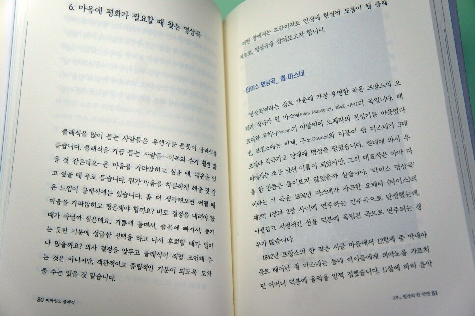 이 책을 읽는 것은 클래식 음악방송을 듣는 듯한 느낌이다. 잔잔한 목소리로 나긋나긋 풀어내는 이야기보따리다. 지휘자 여자경이 일반인들도 알아듣기 쉽게 클래식 음악 이야기를 풀어주고 있다. 클래식 음악 자체에 대해서도 지식을 채울 수 있도록 기본적인 설명을 잊지 않았다. 클래식에 대해 잘 모른다고 생각하던 사람도 의외로 학창시절에 접했던 지식이거나, 아니면 이번에 새로 알게 되는 지식도 있을 것이다. 이 책을 읽으며 클래식 음악에 대한 지식을 채우는 시간을 갖는다.