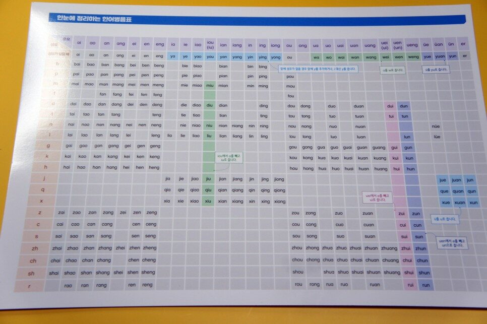 사진은 한눈에 정리하는 한어병음표다. 뒷면에는 중국어 문장 구조에 대한 설명이 있다. 이렇게 도표로 만들어 한눈에 정리하도록 도와주니 많은 도움이 되겠다.