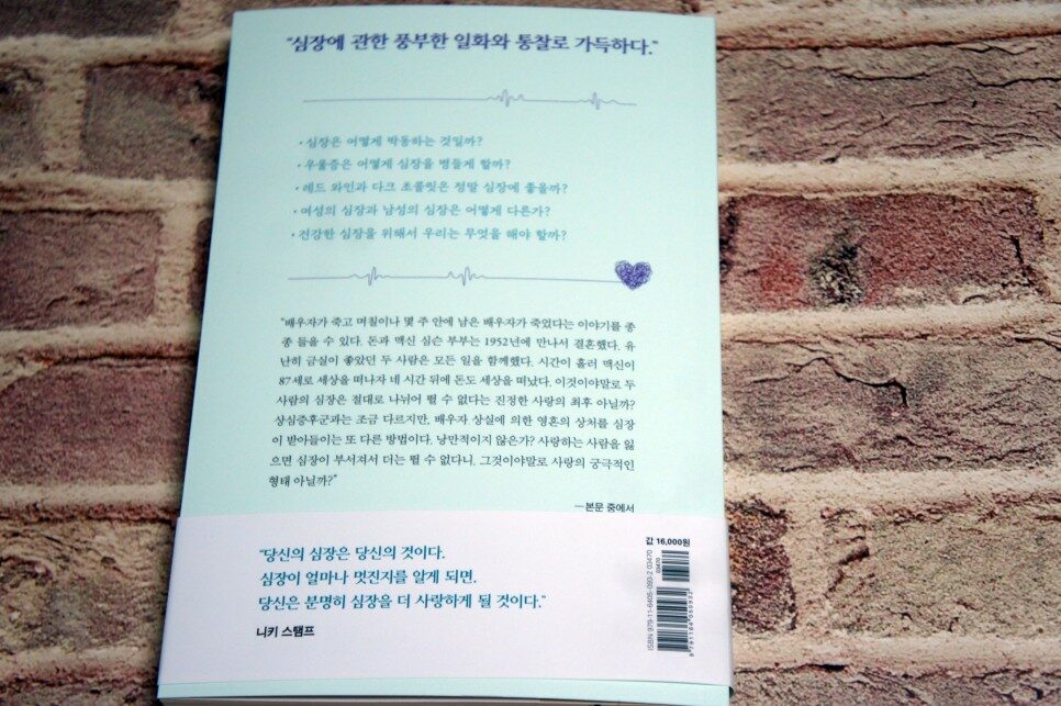 민간 전승과 고대 의학에서 심장은 언제나 마법처럼 생명을 살아 있게 하는 정수로 그려지는데, 내가 생각하는 심장도 바로 그런 느낌이다. 이제부터 가슴에서 엄지손가락 길이만큼 안쪽에 있는 이 기관이 발휘하는 마술과 이 기관에 관한 지식을 나눌 것이다. 신나면 팔딱팔딱 뛰고 겁나면 쿵쾅쿵쾅 뛰는 심장에 관한 이야기를 당신과 나누고 싶다. 마음과 몸과 영혼을 다해 심장을 돌볼 수 있도록, 당신이 당신의 심장을 정말로 사랑하기를 바란다. (10쪽)