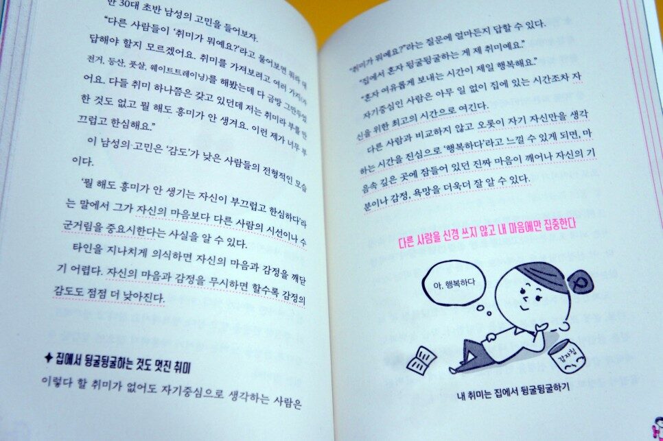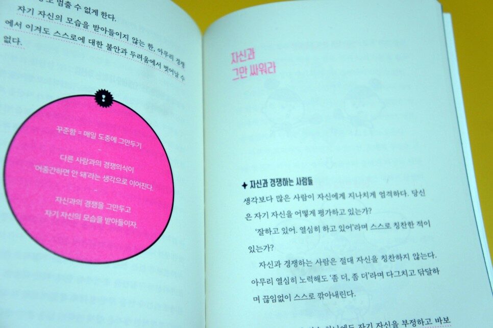 이 책은 지금까지의 삶의 자세를 다르게 바라보도록 도움을 준다. '어, 안 그래도 되는 거였잖아?'생각하면서 부담감을 덜게 해준다. 그러니까 좀 더 진득이 참고 견디면서 노력을 해야 하는 것이 아니라 '마음에 안 들면 그만둘 수도 있는 거지, 그게 뭐?'라고 반응해 주니 한결 편안해진다. 특히 '외부의 기준에 자신을 맞추려 하면 할수록 '진정한 자신'은 점점 사라진다(19쪽)'라는 말에 주목할 필요가 있다. 더 이상 나 자신에게 상처만 주지 말고 나 자신의 마음에 귀를 기울이고 들여다보아야 할 것이다.