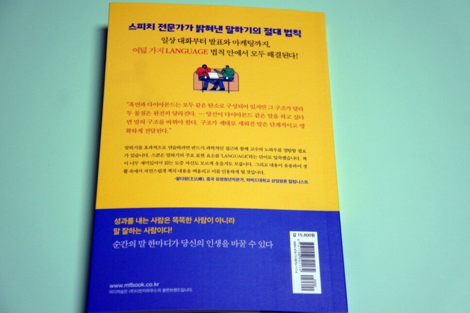 이 책은 스피치 전문가가 일러주는 말하기의 절대 법칙 8가지를 담은 책이다. 말하기, 대화법, 스피치 등등 이런 류의 책을 볼 때 비슷비슷한 느낌이었다면, 이 책은 좀 더 새로웠다는 점이 다르다. 보다 구체적이고, 예시 하나하나가 흥미롭고, 무엇보다 '아, 이거 적용하면 좋겠네'라는 생각이 드는 부분을 발견하는 재미가 있다는 것이다. 아는 것과 실천은 다르니 종종 이 책의 도움을 받아서 말하기 능력을 업그레이드 시켜 보아야겠다.