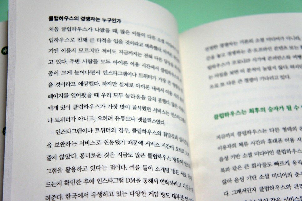 그런데 우리는 역시 같은 시대에 전혀 다른 세상을 살아가고 있나 보다. 나는 클럽하우스에 대해 책으로 접했으니 말이다. 아마 이제 시작이거나 조금씩 인기몰이를 막 일으키고 있으리라 짐작된다. 어쨌든 이 책을 읽으며 클럽하우스의 역사와 장점, 특징과 차이점 등등 클럽하우스에 대해 알아가는 시간을 보낸다.