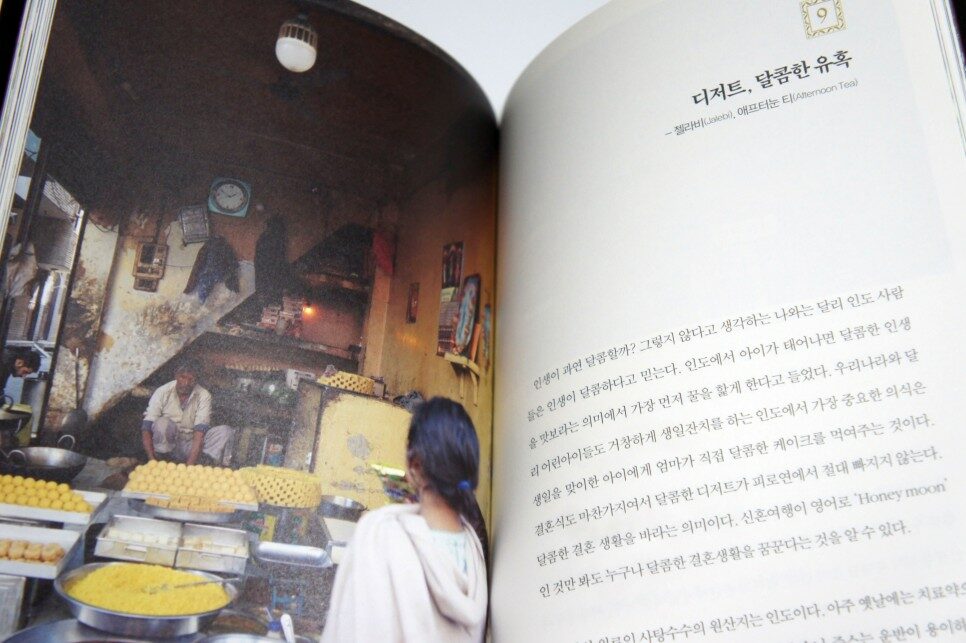 젤라비는 우리나라의 약과와 비슷하다. 설탕을 밀가루에 버무려 튀기고 그걸 다시 설탕물에 졸인 '튀김 설탕 과자' 젤라비. 지역마다 젤라비의 형태는 조금씩 다르지만, 기름이 든 커다란 솥에 젤라비를 튀겨내는 모습은 인도의 거리 어디서나 흔히 볼 수 있는 풍경이다. 젤라비가 대중적인 간식이라면 우리나라의 다식과 비슷한 캐슈너트 바르피는 다이아몬드 모양으로 잘라 은박지를 곱게 입힌 특별한 간식이다. 다식이 송화가루나 검은깨로 만든다면 캐슈너트 바르피는 캐슈너트의 가루를 이용해 만드는데, 공을 아주 많이 들이는 간식인 만큼 인도 최고 축제인 디왈리 때 주위 사람들과 선물로 주고받는다. 나도 현지인으로부터 둘레를 인조 진주로 장식한 화려한 상자에 담긴 바르피를 선물 받은 적이 있는데, 우리나라의 멋진 대나무 상자에 담긴 한과 선물세트와 참 많이 닮았다는 생각이 들었다. (94쪽)
