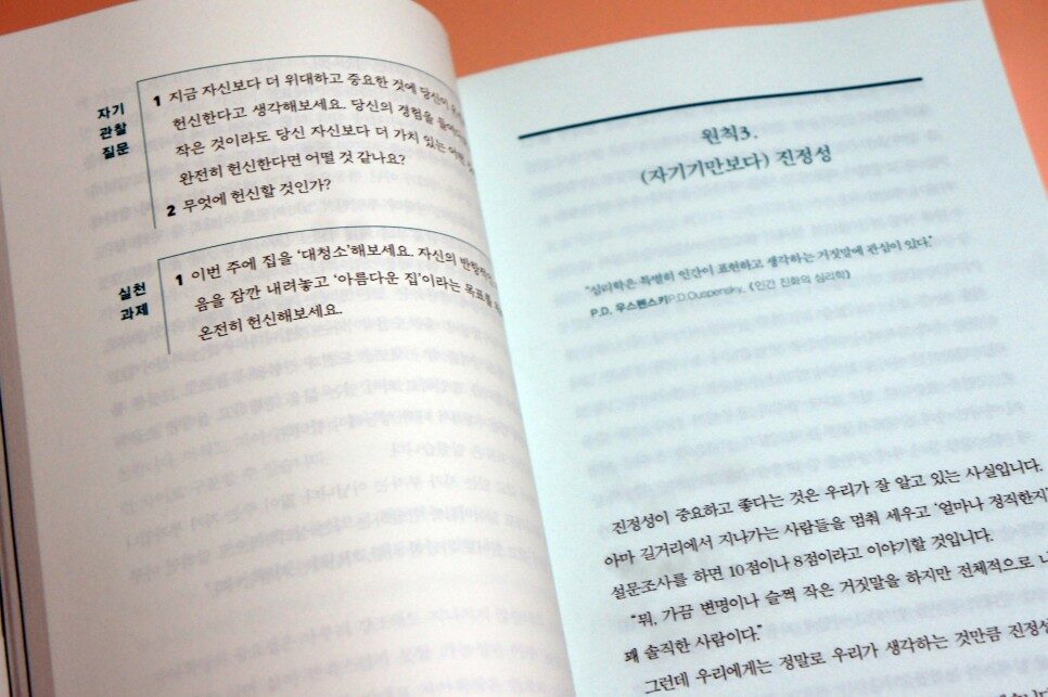 이 책을 읽으며 그동안 어렴풋이 '그런 것 같다'라고 생각만 하던 부분은 구체화시켜서 '아, 그런 이유에서였구나.'라고 깨닫게 되고, 미처 인식하지 못했던 문제에 대해서도 글을 읽으며 퍼즐 조각을 맞추듯 깨달아가는 시간을 보낸다. 구체적인 예시를 통해 단번에 그 상황을 이해할 수 있도록 설명해 준 것이 도움이 된다. 무언가 흐릿하게 막혀있는 상황에서 깔끔하게 정리를 해주는 기분이 든다.
