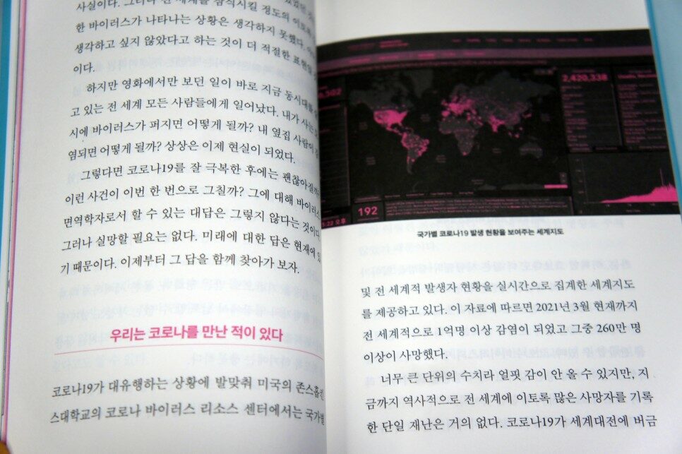 매일 코로나19 감염자 현황을 살펴보며 좁은 시야에서만 코로나를 바라보다가 이렇게 거시적으로 바라보니 색다른 느낌이 든다. 코로나19의 영향을 받는 세상이 언제쯤 끝날 수 있을까. 저자는 '코로나19는 지구상에서 사라지지는 않더라도, 지금보다 치명률은 점점 낮아지면서 가까운 미래에는 가벼운 감기의 일종으로 인류에게 남아 있을 것이다. 다만 아직 단언할 수 없는 것은 그 가까운 미래가 언제인가 하는 점이다.(104쪽)'라고 언급한다. 이 정도면 희망을 가져도 좋을까.