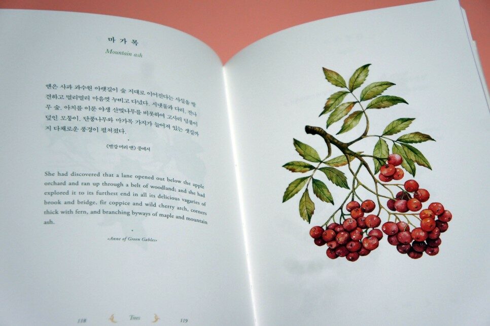 꽃, 나무, 열매의 이름을 시작으로 《빨강 머리 앤》 중에 나왔던 문장이 짤막하게 이어지고, 그 밑에는 영어 원문이 수록되어 있다. 오른쪽 페이지에는 수채화 그림이 곁들여져 있으니, 식물에 대한 글과 그림으로 빨강 머리 앤을 다시 만나보는 시간을 갖는다.