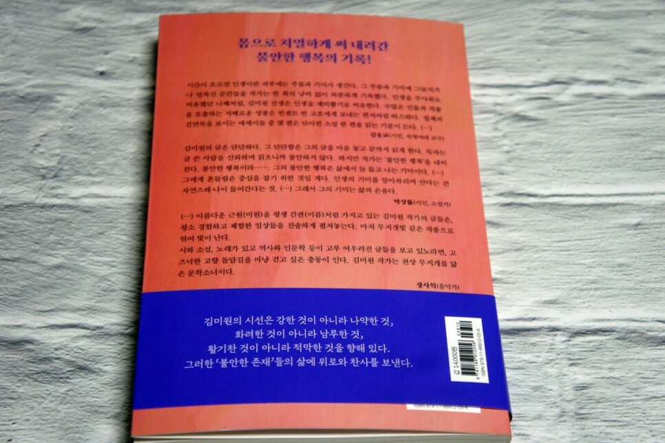 이 책의 저자는 김미원. 1959년 12월 엄마가 김장 배추에 미끄러져 넘어지면서 양수가 터지는 바람에 팔삭둥이로 태어났다. 평생 야인으로 사신 이상주의자 아버지와 생활력 강한 엄마 사이에서 때론 흔들리고 균형감각을 체득했다. 2005년 수필가로 등단해 수필집 『즐거운 고통』 ,『달콤한 슬픔』을 냈다. (책날개 발췌)