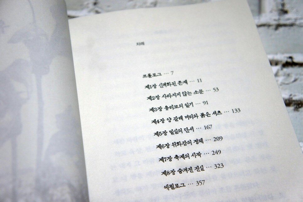 이 책은 총 8장으로 구성된다. 1장 '신격화된 존재', 2장 '사라지지 않는 소문', 3장 '유리코의 일기', 4장 '양 갈래 머리와 붉은 셔츠', 5장 '밀실의 단서', 6장 '위화감의 정체', 7장 '축제의 시작', 8장 '숨겨진 진실'로 나뉜다.