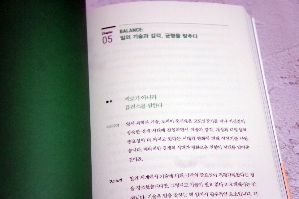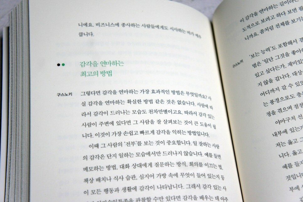 이 책을 선택한 때의 마음은 단순히 일 잘하는 데에 필요한 기술을 얻고자 한 것이라면, 이 책을 읽고 나면 일단 그 마음보다는 훨씬 폭이 넓고 깊어질 것이다. 생각지 못했던 부분에 대해 건드려주어 지적 호기심을 충족시켜주고, '감각'에 대한 생각조차 그동안 편견에 휩싸여있었다는 생각이 든다. 일과 감각은 얼핏 보면 딱히 어울리지 않으리라 생각되지만, 이 책에서 강조하는 것은 '감각'이다.