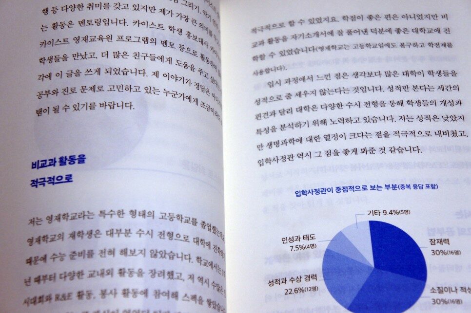 이 책은 정시, 학종, 자소서, 면접 노하우를 총망라한 책이라고 하니, 관심 있는 수험생과 학부모가 많을 것이다. 대학입시 준비를 위해 무작정 노오력만 하기보다는 입시 전략에도 기술이 필요할 테니 그 방법을 모색해보는 시간도 필요하겠다. 이 책 『대학을 바꾸는 공부법』을 읽으며 '공부의 왕도' 찾기 프로젝트에 동참해보는 것은 어떨까.