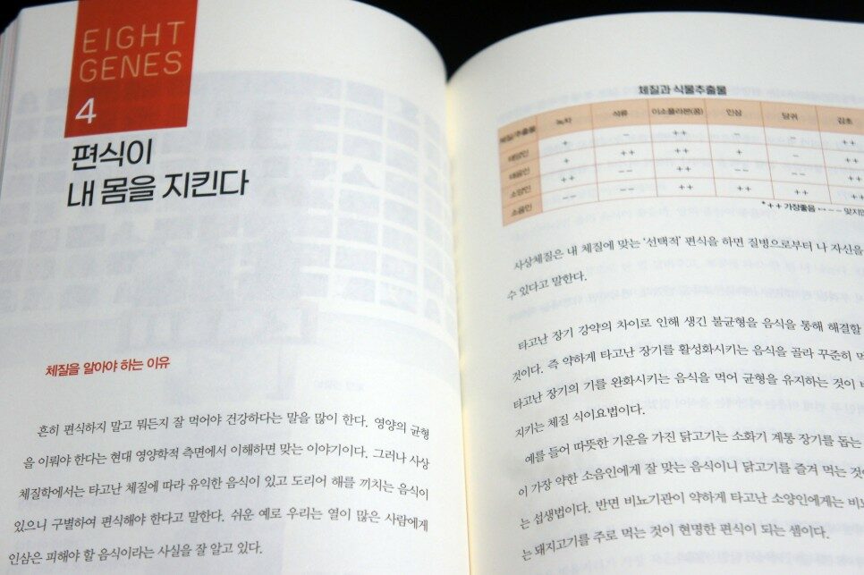 사실 체질의 진면목은 의료 분야에서 벗어나 더욱 확장할 때 드러난다. 장기의 강약에 따라 구분되는 체질은 놀랍게도 체형, 성격, 행동은 물론 그에 따라 직업과 직무 선택, 인간 관계, 취미 활동, 특기와 운동, 공부법, 스트레스 해소법, 패션에 이르기까지 실로 다양한 삶의 분야에 영향을 끼친다. 즉 체질을 올바로 알고 적용한다면 삶이 건강하고 행복한 방향으로 나갈 수 있게 된다. 이 책은 8Genes이 얼마나 우리 삶 깊숙이 들어와 영향을 미치고 있는지 분석해주고, 이를 기초로 하여 건강, 다이어트, 자기계발, 소통 등의 라이프스타일을 코칭해주는 기본서이다. (28쪽)
