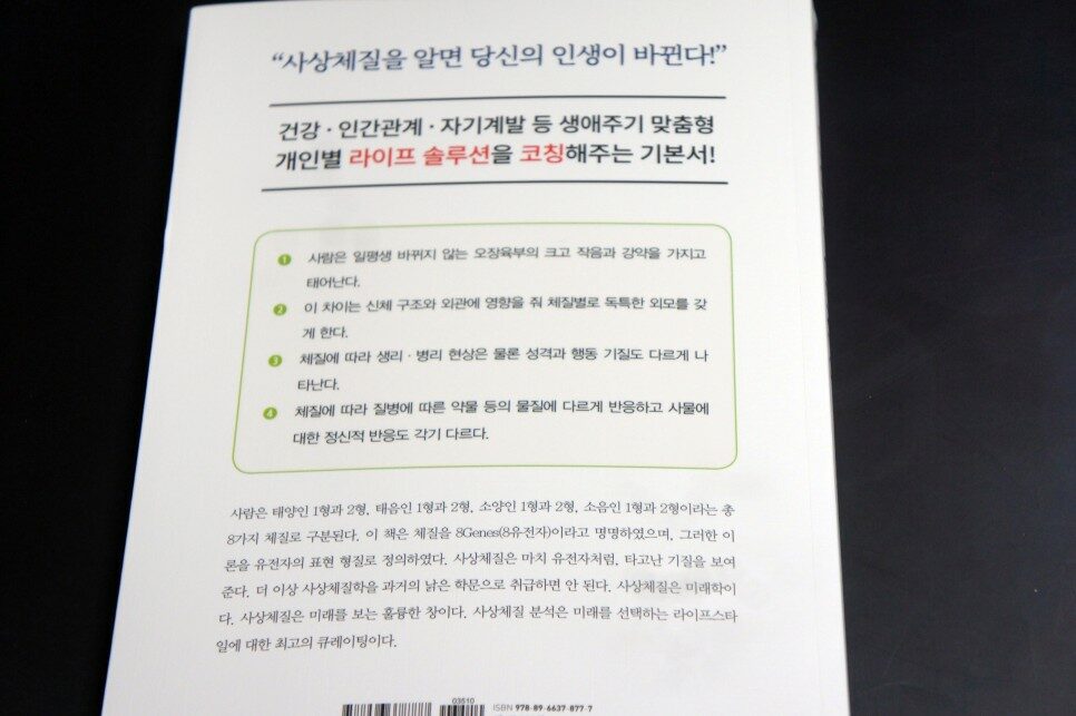 이 책을 보니 사상체질의 활용도는 상당히 높다는 생각이 든다. 제대로 진단만 해준다면 자신의 체질에 맞게 생활 전반에 걸쳐서 활용할 수 있는 것이 사상체질인 것이다. 의사 필요 없이 일상에서 건강을 챙긴다는 것은 중요한 일이며, 서로 다른 체질의 사람에 대한 이해의 폭도 넓힐 수 있으니 여러모로 라이프 전반에 걸쳐 필요한 것이다. 그러니 '개인별 라이프 솔루션을 코칭해주는 기본서'라는 점에 동의하게 된다.