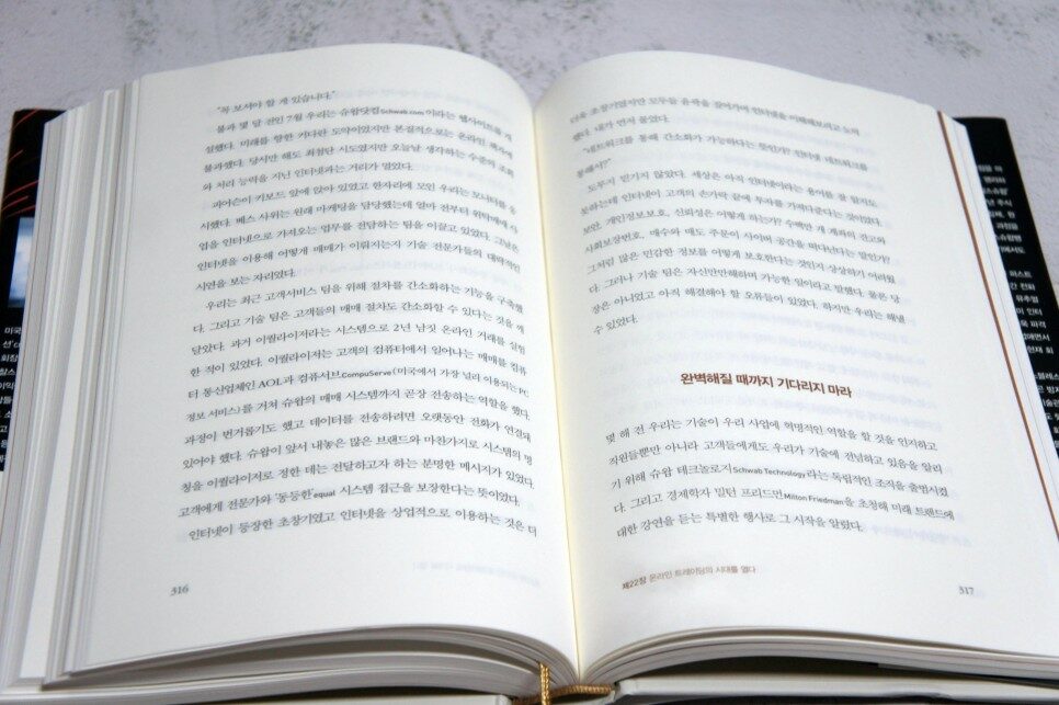 '그것이 이 책의 요점은 아니지만'이라고 했지만, 그것이 이 책만의 특징을 만들어주었고 이 책을 읽어보고 싶다는 생각을 하게 했다. '사업은 결국 사람과 사람이 하는 일'이라는 것에서 이 책의 의미를 찾을 수 있다. 인생을 걸고 자신만의 사업을 갈고닦기 위해 어떤 마인드로 나아갈지 큰 틀에서 생각해 보고자 한다면 이 책을 한 번 읽어보는 것도 좋을 것이다. 나에게는 찰스 슈왑이라는 경영자이자 투자자의 발자취를 훑어보는 시간을 갖게 한 책이다.