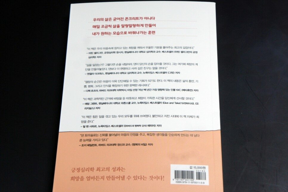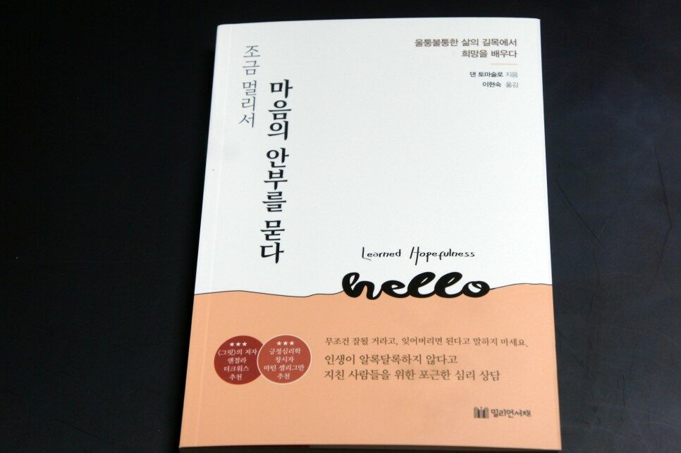 이 책의 표지에 이런 글이 있다. '긍정심리학 최고의 성과는 희망을 얼마든지 만들어낼 수 있다는 것이다'라고 말이다. 희망은 그냥 뚝 떨어지는 것이 아니라 내가 만들어낼 수 있다고 생각해 보면 얼마나 멋진 일인가. 게다가 '매일 조금씩 삶을 말랑말랑하게 만들어 내가 원하는 모습으로 바꿔나가는 훈련'을 한다고 하니 한 번 해봐야겠다는 생각이 들었다. 어떤 이야기를 들려줄지 궁금해서 이 책 『조금 멀리서 마음의 안부를 묻다』를 읽어보게 되었다.